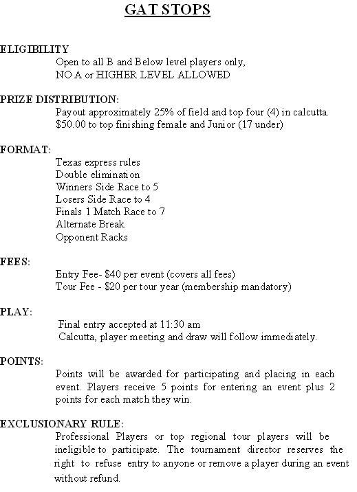 | Welcome to the home of the GAT07' Gateway Amateur 9-Ball Tour 2007! The GAT is a division of Zim's Rack Billiard Promotions www.zimsrack.com |