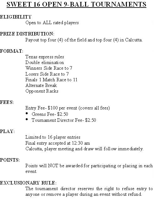 | Industry Sponsors Slip Stic Pool & Billiard Magazine AZBilliards.com Ultimate Pool Players Magazine Online On The Hill Q Sales Sterling Gaming Zim's Rack Billiard Promotions |